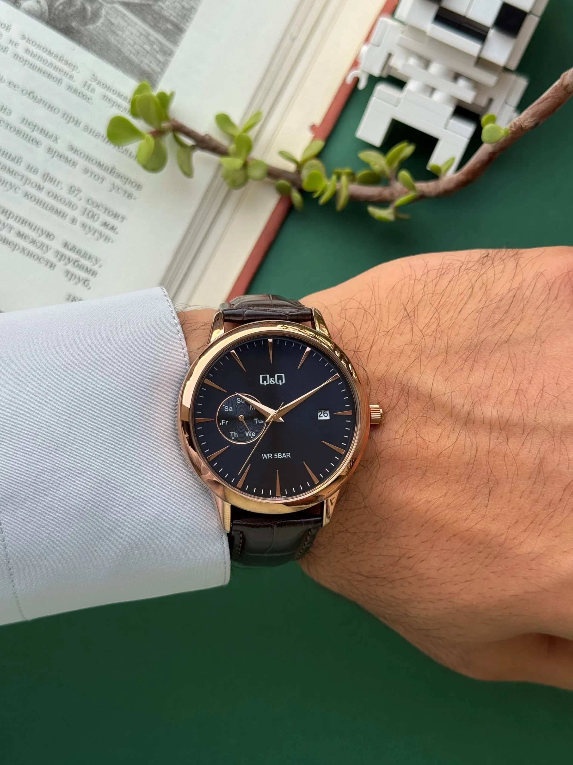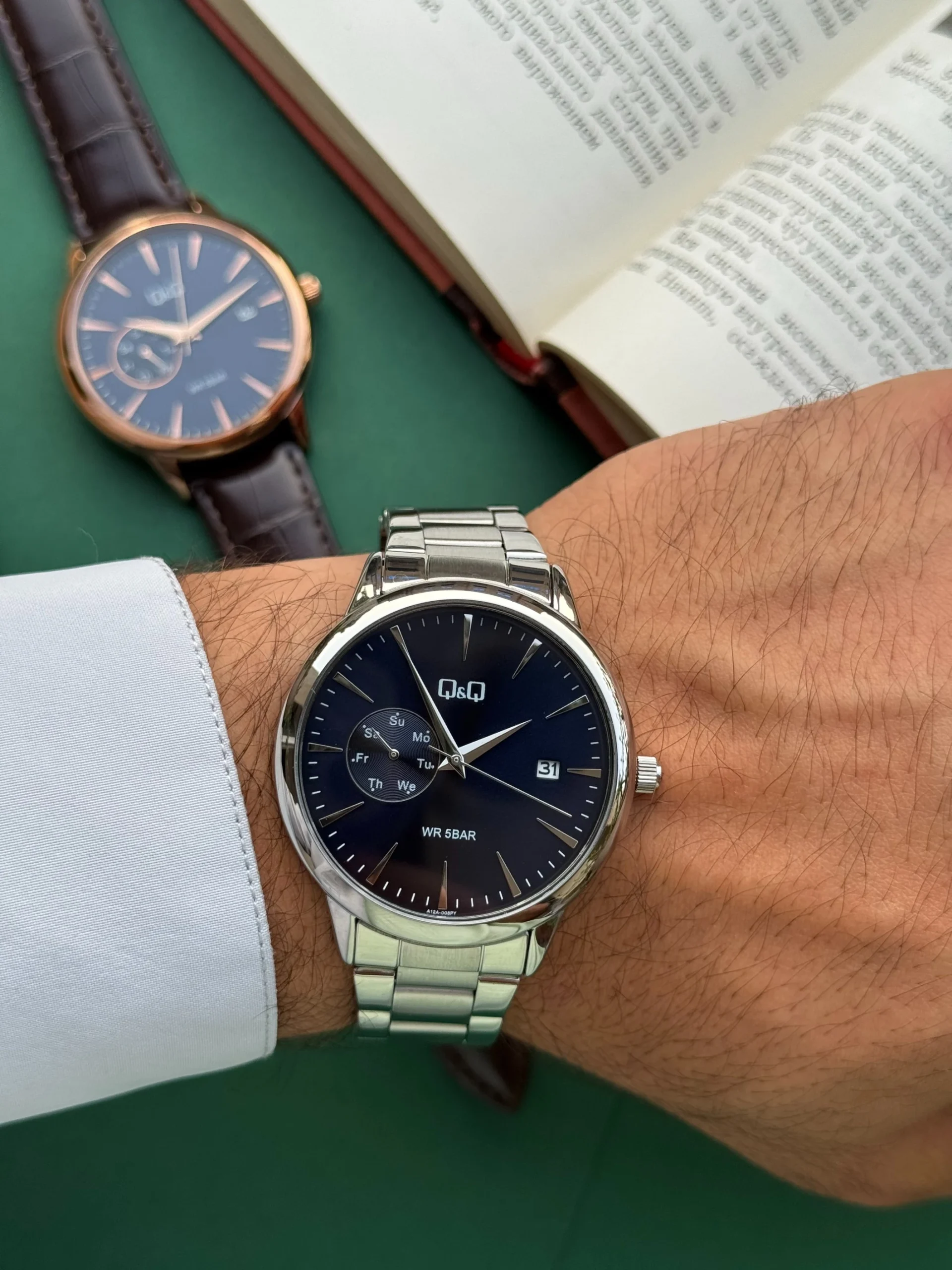 قاب فلزی ظریف با فریم طلایی در کنار بند چرمی قهوهای با طرح کروکودیلی، استایلی گرم و کلاسیک به ساعت میدهد. اگر به دنبال ظاهری رسمیتر هستید، میتوانید از بند دوم یعنی بند استیل نقرهای استفاده کنید که حس مدرن و اداریتری دارد. این تنوع در بندها باعث میشود ساعت Q&Q A12A-008 با هر استایل و موقعیتی سازگار باشد — از جلسات کاری تا مهمانیهای رسمی.